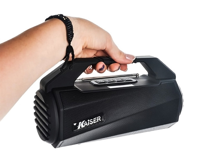 اسپیکر بلوتوثی رم و فلش خور کایزر مدل K-512 از محصولات شرکت KAISER می باشد که به طور بیسیم و از طریق بلوتوث ورژن 5.0 به گوشی موبایل، تبلت و یا هر وسیله دیگری می تواند متصل شود. این اسپیکر انرژی خود را از طریق باتری داخلی با توان 1200 Mph تامین کرده و به خاطر داشتن ابعاد مناسب آن را به راحتی می توانید با خود حمل کنید. اسپیکر کایزر مدل K-512 از درگاه ورودی فلش مموری، کارت میکرو اس دی و همینطور AUX نیز برخوردار است. کایزر K-512 مجهز به صفحه نمایش LED جهت اطلاع از عملکرد محصول و همچنین مجهز به تکنولوژی TWS نیز می باشد.