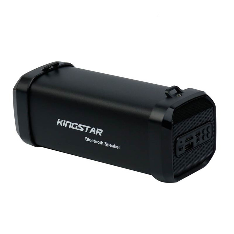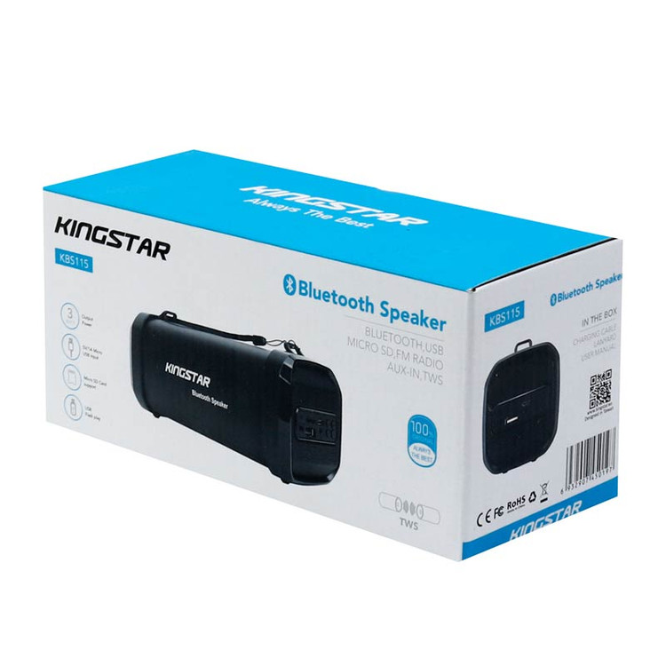 اسپیکر پرتابل KBS115 کینگ استار دارای بدنه ای ساخته شده از متریال باکیفیت و پلاستیک ABS مرغوب و مقاوم بوده و قادر است صداهایی مطلوب را حتی در محیط های نسبتا شلوغ به گوش برساند. این اسپیکر به صورت بی سیم توسط بلوتوث نسخه ۴٫۰ به گوشی های موبایل، تبلت و دیگر دستگاه های سازگار متصل می شود و تا شعاع ۱۰ متری، ارتباطی پایدار و بدون قطعی را (در صورت نبود مانع) برقرار می کند. علاوه بر این، رابط جک صوتی ۳٫۵ میلی متری، شیار رم میکرو SD و پورت فلش مموری USB نیز در این دستگاه فراهم شده تا روش های بیشتری جهت دسترسی کاربر به فایل های صوتی و آرشیو آهنگ ها وجود داشته باشد. از قابلیت های جالب و کاربردی پخش کننده صوتی Kingstar، مجهز بودن به فناوری TWS می باشد که اتصال دو عدد از اسپیکر هم نوع را به یک منبع بلوتوث امکانپذیر کرده تا پس از سینک شدن، صدایی قوی از هر دو اسپیکر، به صورت همزمان شنیده شود. اسپیکر بلوتوثی رم و فلش خور KingStar KBS115 با پشتیبانی از درایور ۲ اینچی و توان خروجی ۳ وات، قابلیت پخش صدایی شفاف و استریو را در محدوده پاسخگویی فرکانسی ۱۰۰ هرتز تا ۱۶ کیلو هرتز با امپدانس ۴ اهم خواهد داشت و امکان شنیدن طیف وسیعی از صداهای زیر و بم را واضح و با بیس قدرتمند ارائه می دهد. این دستگاه همچنین به رادیو FM نیز مجهز است تا کاربران بتوانند با گرفتن سیگنال کانال ها، از پخش باکیفیت برنامه های رادیویی مورد علاقه ی خود لذت ببرند. اسپیکر بی سیم کینگ استار دارای باتری ۱۵۰۰ میلی آمپر ساعتی می باشد که ماندگاری شارژ آن با حداکثر میزان حجم صدا حدود ۳ ساعت اعلام شده است، شارژ مجدد باتری نیز از طریق کابل Micro USB همراه محصول نجام می شود. در بخش کناری این اسپیکر، یک پنل شامل دکمه های فیزیکی مختلف به منظور مدیریت بخش موسیقی، تنظیم ولوم، رادیو و … برای دسترسی و کنترل راحت تر قرار داده شده است.