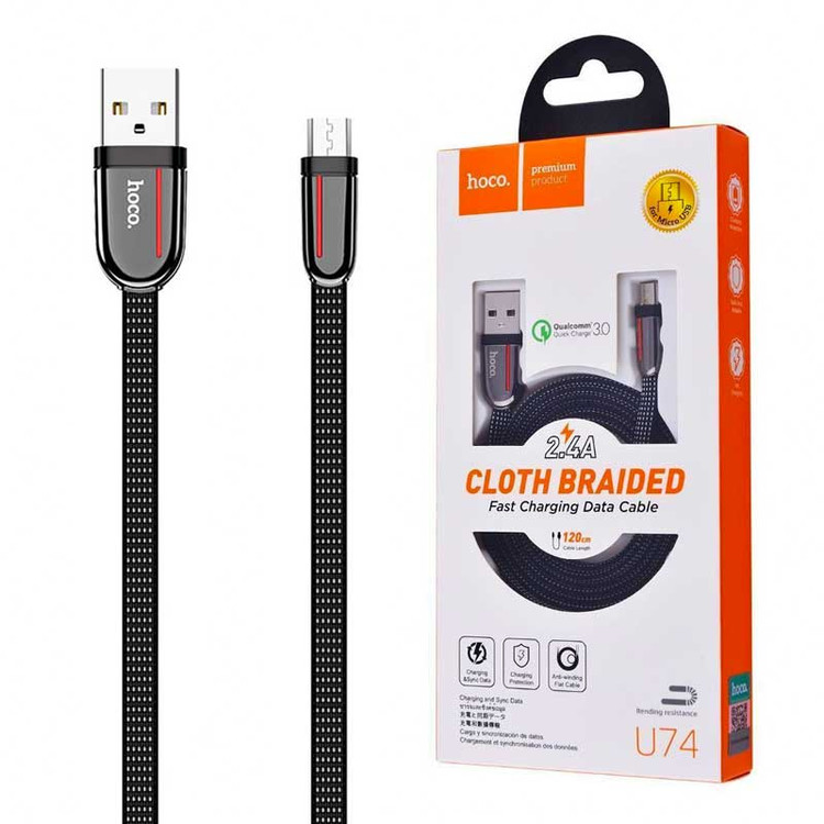 کابل میکرو یو اس بی Hoco U74 Grand نیز یک محصول خوش ساخت است که توسط کمپانی چینی هوکو برای کاربران گوشی های اندرویدی طراحی شده است، این کابل طولی معادل ۱٫۲ متر دارد تا در تمامی استفاده های روزمره آزادی عمل لازم را برای کاربر فراهم کند. هوکو این کابل را به صورت تخت طراحی کرده تا تمایز ان را نسبت به رقبا به رخ بکشد، همچنین روکش این کابل به صورت پارچه بافی ساخته شده تا شاهد مقاومت و استحکام کافی در آن باشید. کانکتور های Hoco U74 Grand جنسی فلز دارند و خبری از خوردگی و زنگ زدگی در آن ها نیست، همچنین این کابل از انتقال اطلاعات پشتیبانی می کند تا با اتصال به رایانه بتوانید با نهایت سرعت داده های خود را منتقل کنید.
