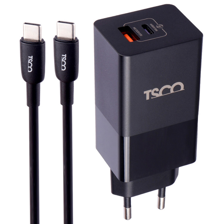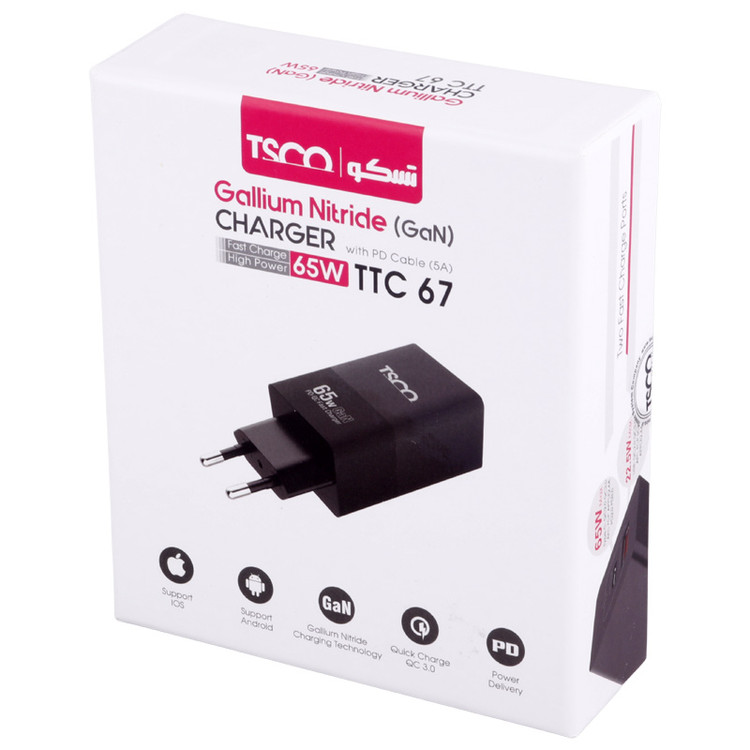 شارژر دیواری فست شارژ TSCO TTC 67 GaN 2Port QC3 PD 5A 65W Type-C + کابل تبدیل تایپ سی
